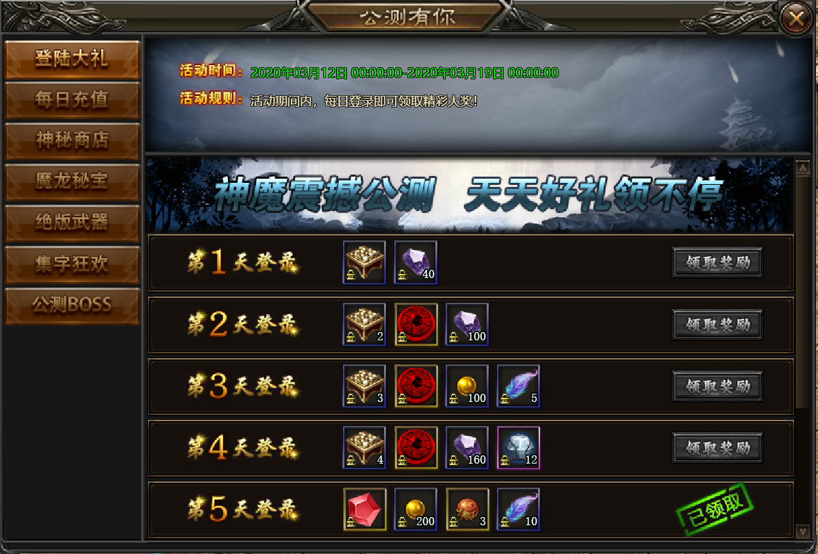 活动时间:2020年03月12日00:00—2020年03月18日24:00【活动期间开的新服 公测活动顺延,例如3月12日开放的新服,公测活动将会在7天后,3月19日出现】