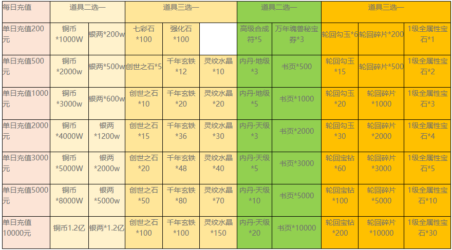 如:小明单日累计充值2200元,可领取2000元、200元档奖励,可申请2000元大礼包+200元大礼包