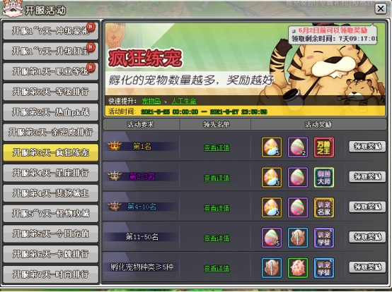 玩家在开服后的三天时间里挑战的宠物训练场的层数,将会以名次排行的形式展示在开服活动界面相关的页签,名次排行共分5挡