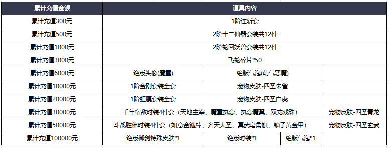 活动说明:单个角色单个区服累计充值达成